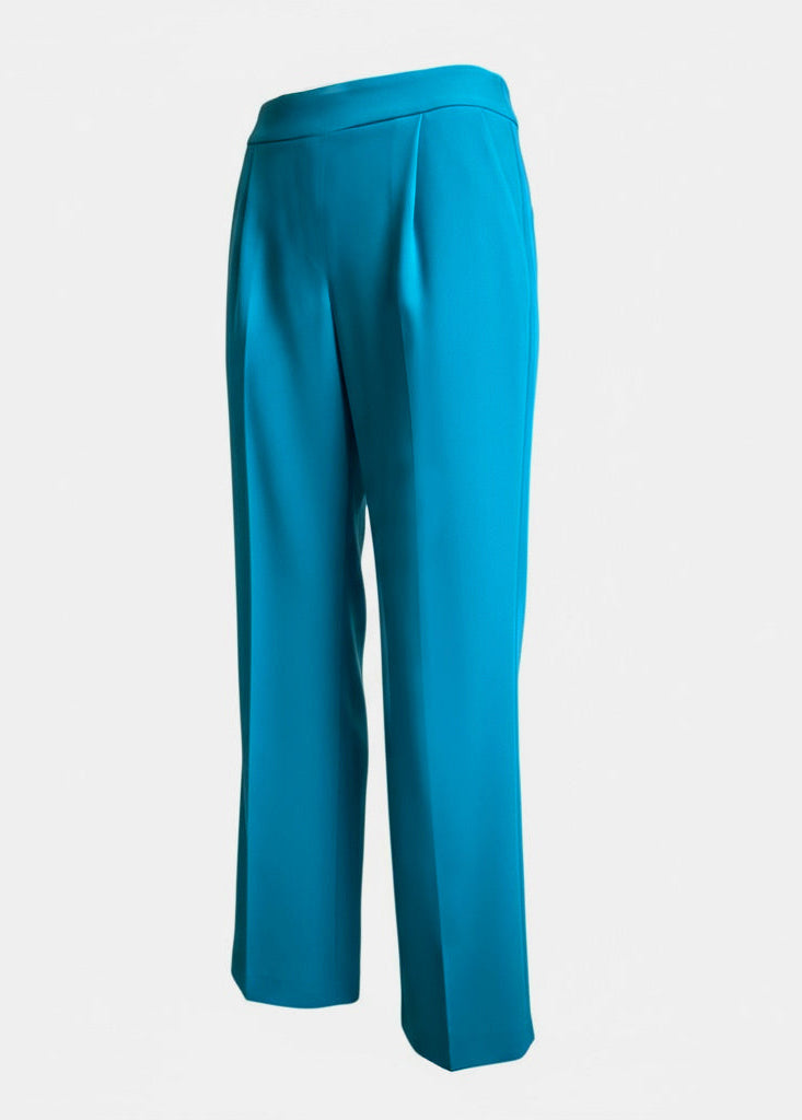 Klassische Marlenehose mit Bund und Reißverschluss hinten. Mit Taschen und Bundfalten vorne. Das Bein fällt gerade nach unten. Klassische Businesshose aus 100% Wollcrepe in wunderschönen, leuchtenden Türkis